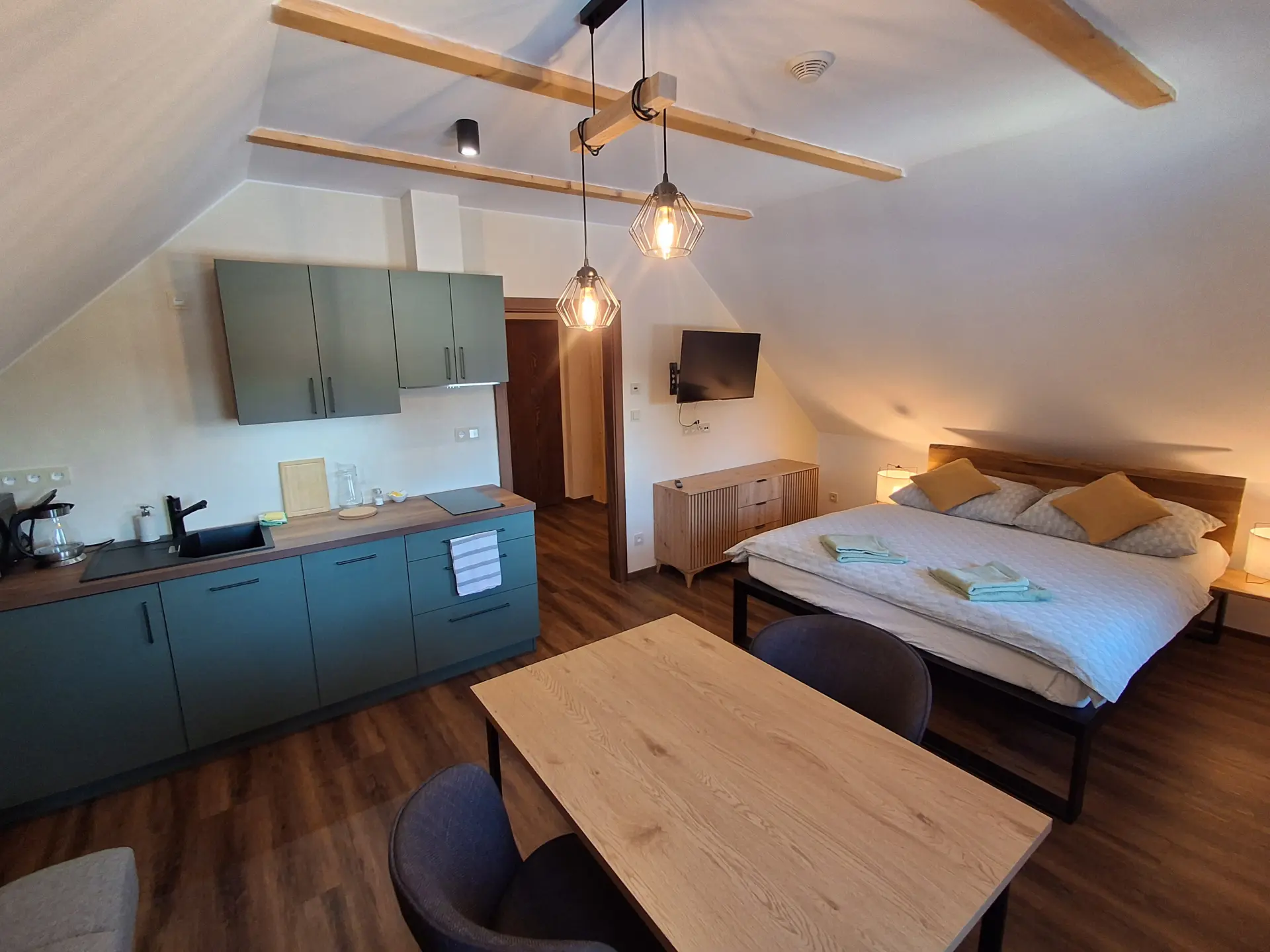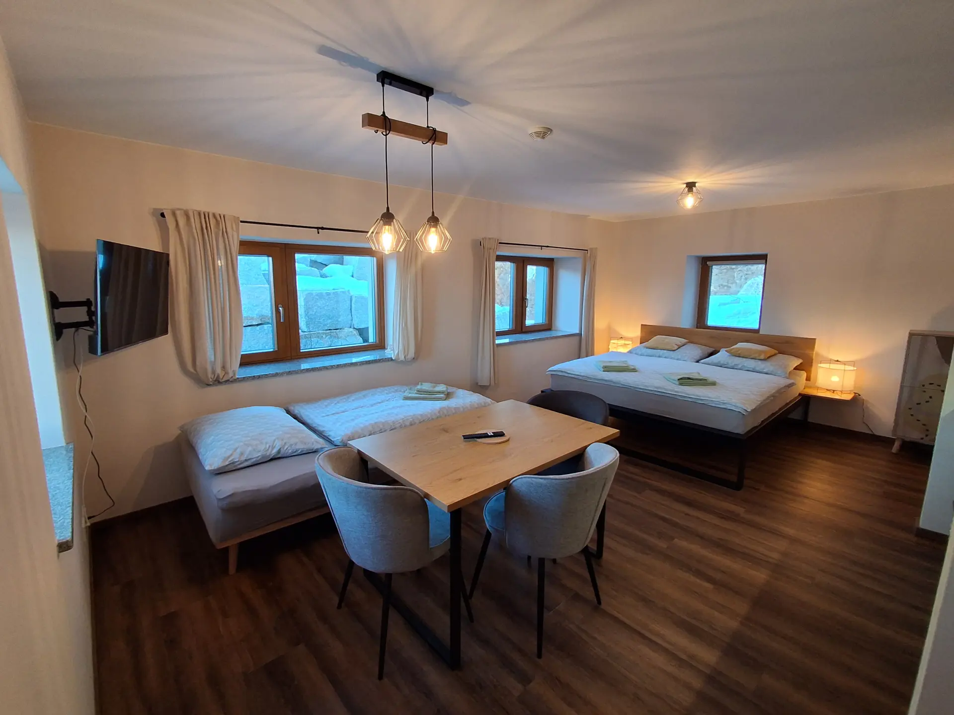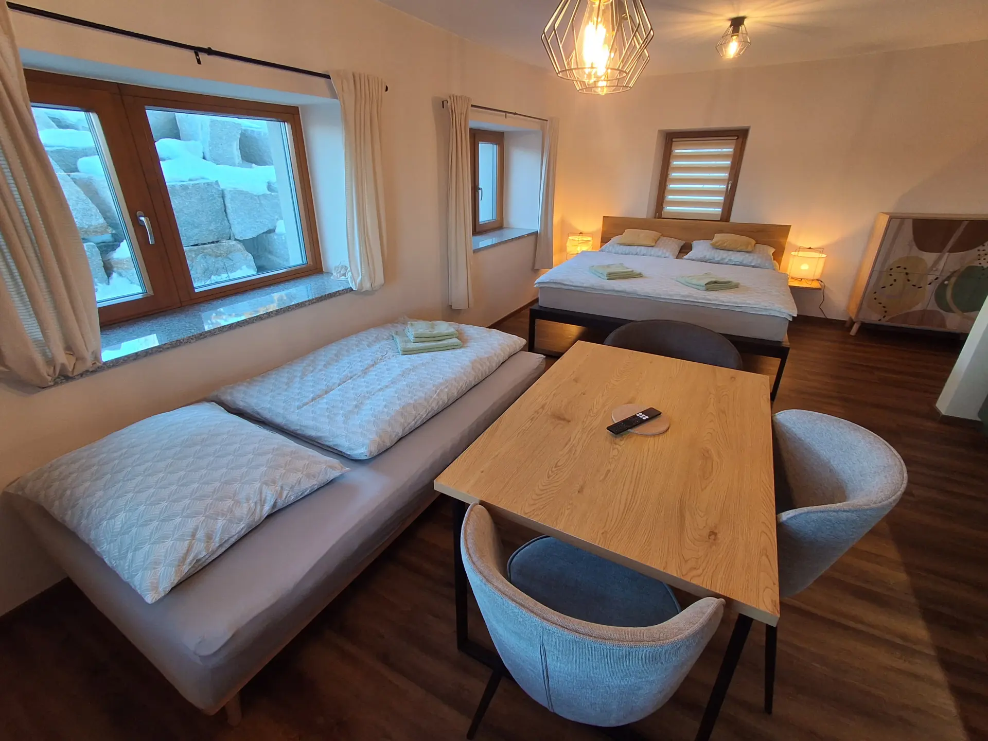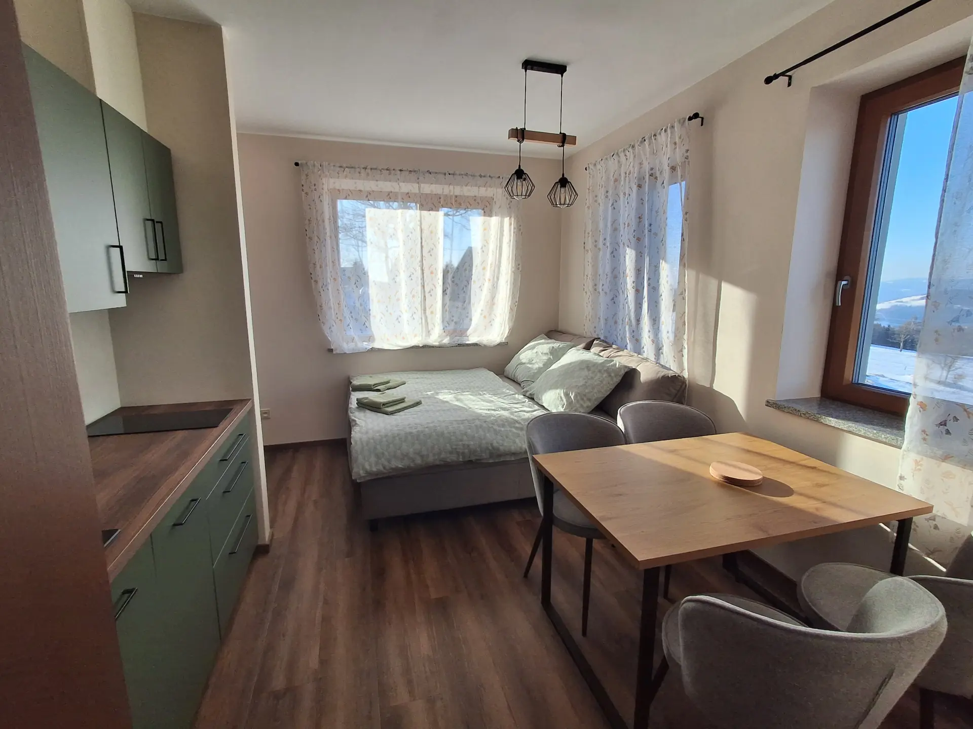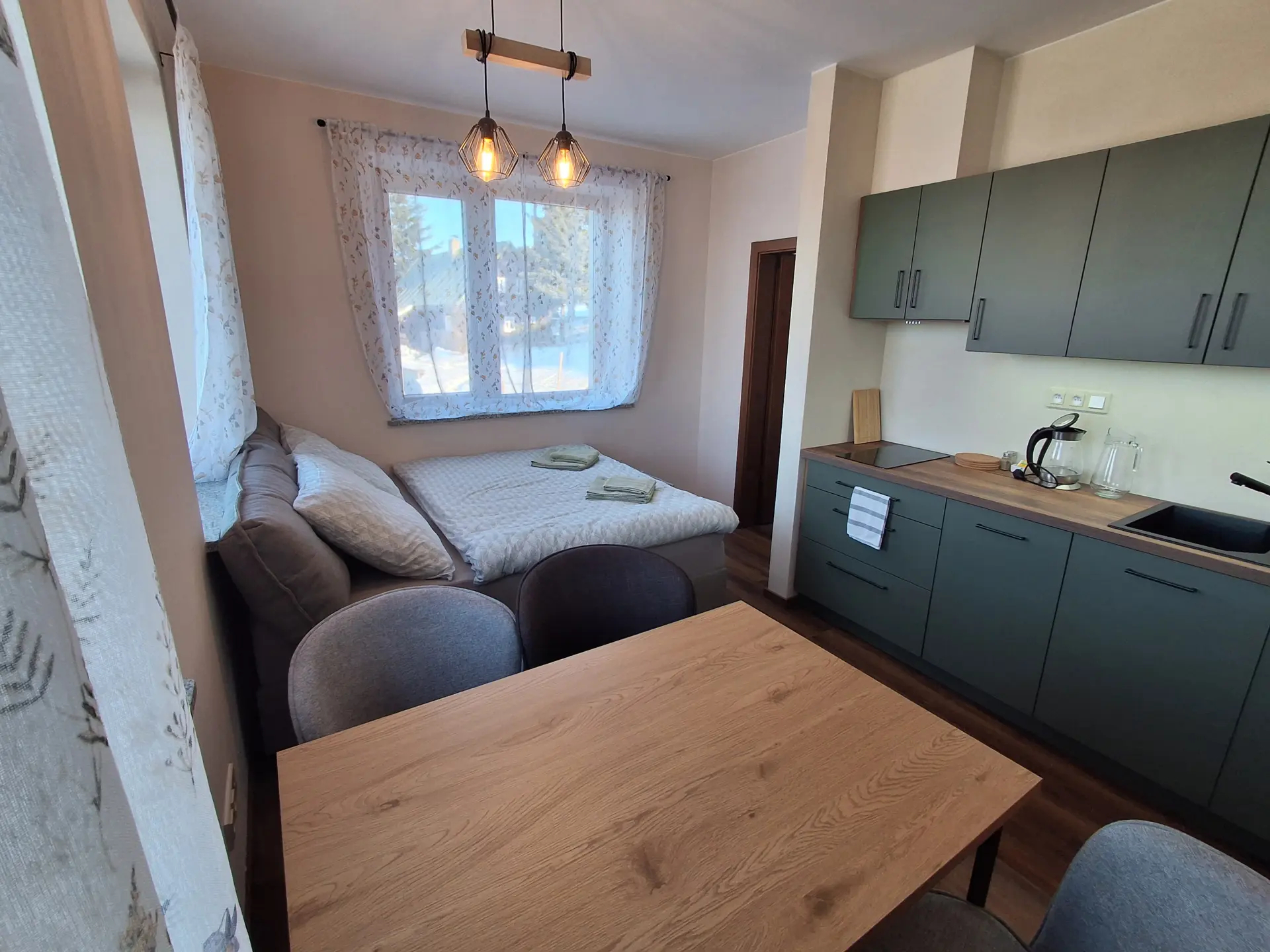 Apartmán v 1. patře počet ubytovaných osob max. 4 - postel 180 x 200cm přistýlka 160 x 200cm. Plně vybavená kuchyň - indukční deska, mikrovlnná trouba, lednice, myčka. Samostatná ložnice, koupelna. Televizor, samostatné připojení k internetu, velikost 34 m2, pěkný výhled na Jizerské hory.