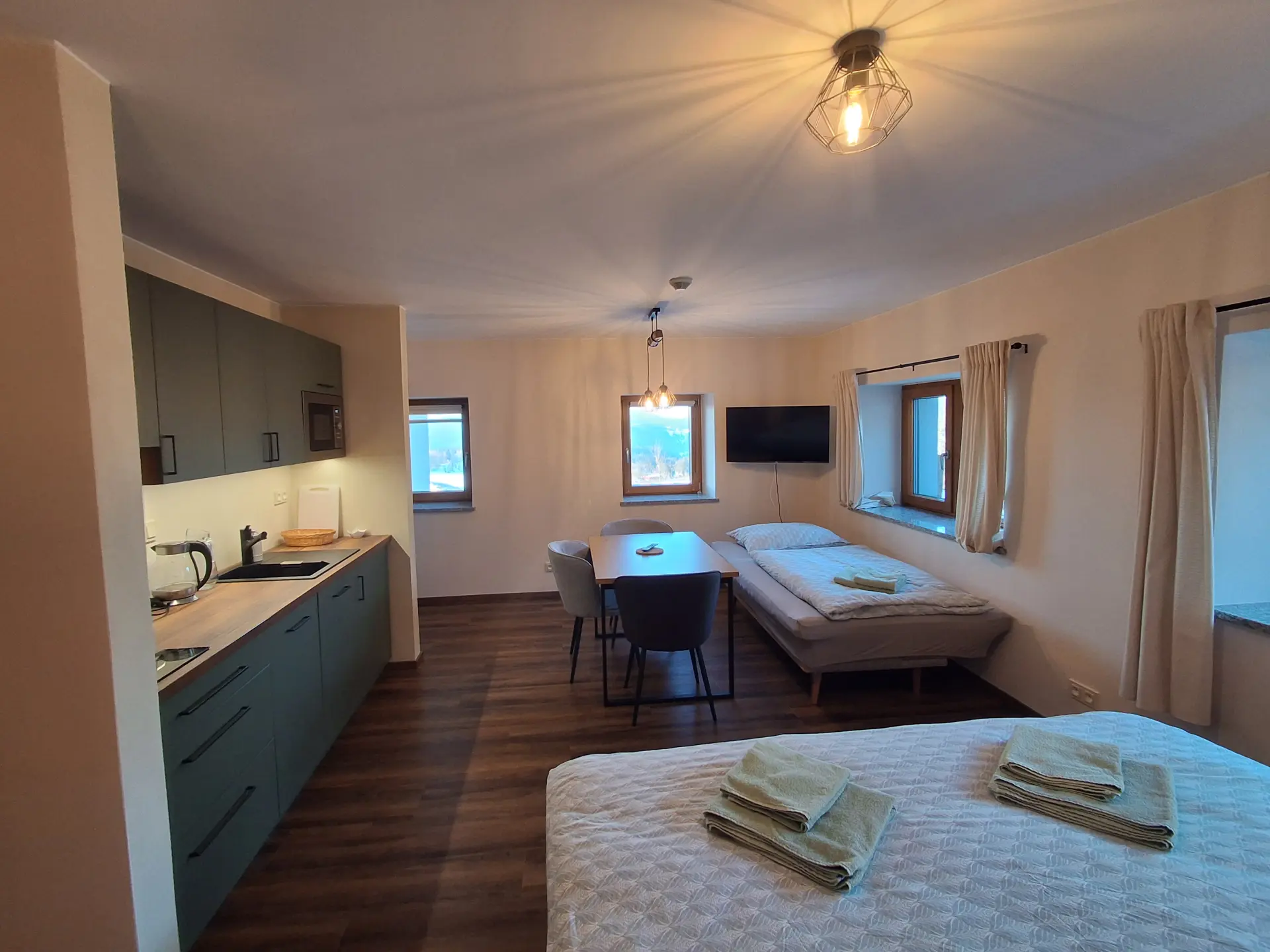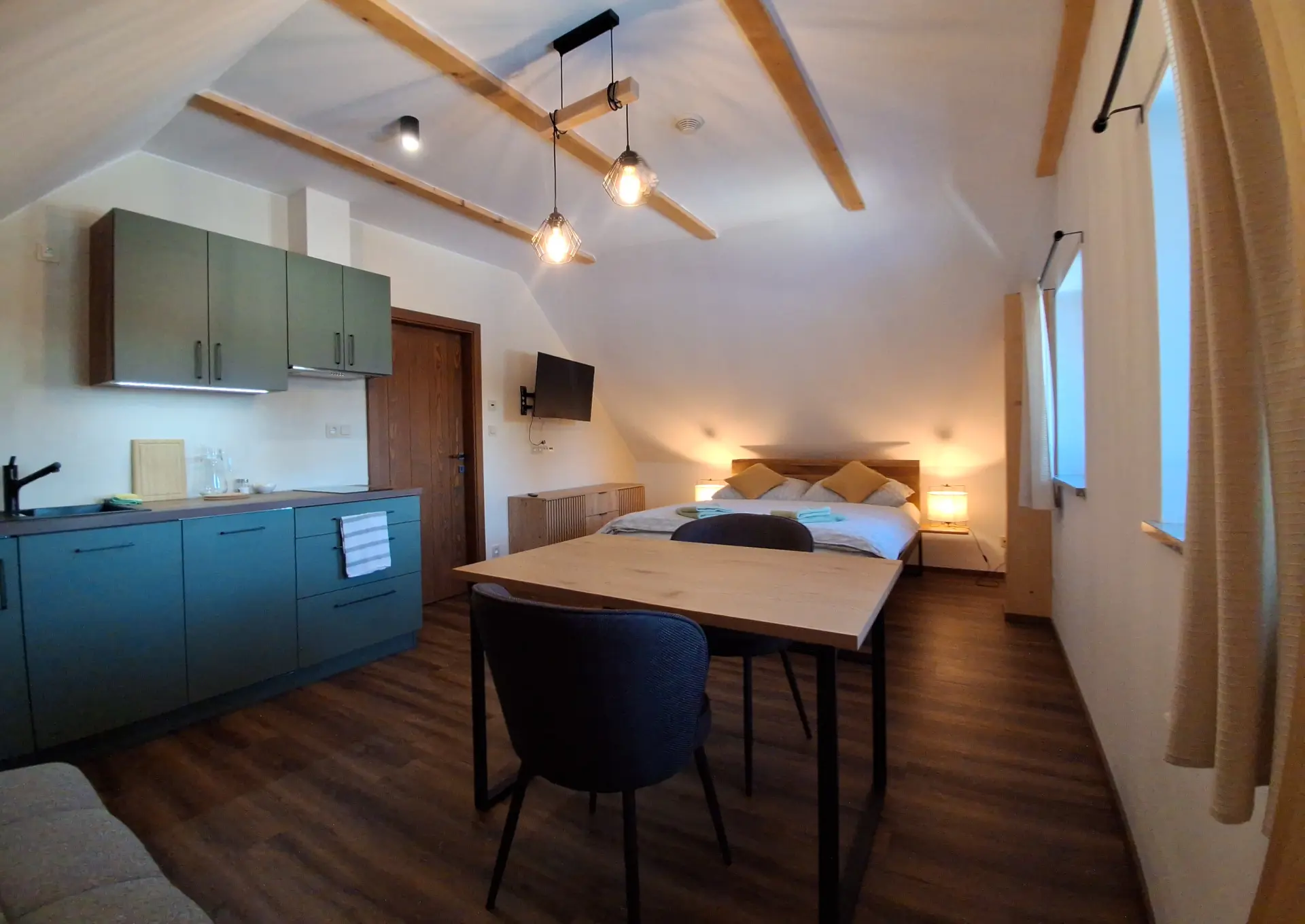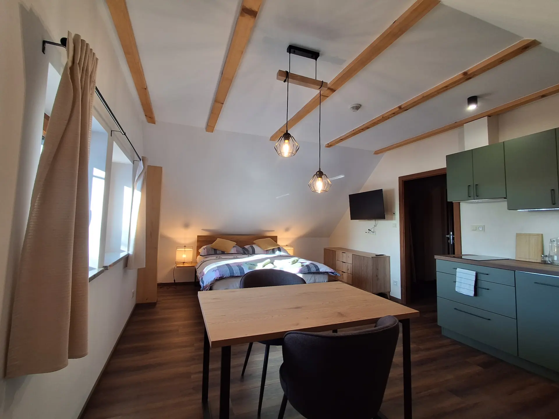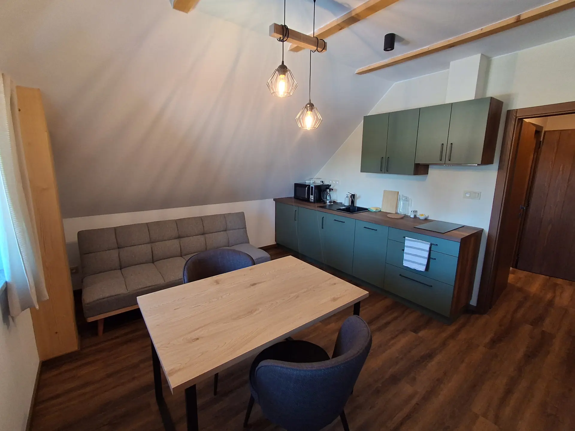 Apartmán v 1. patře počet ubytovaných osob max. 4 - postel 180 x 200cm přistýlka 160 x 200cm. Plně vybavená kuchyň - indukční deska, mikrovlnná trouba, lednice, myčka. Samostatná ložnice, koupelna. Televizor, samostatné připojení k internetu, velikost 34 m2, pěkný výhled na Jizerské hory.