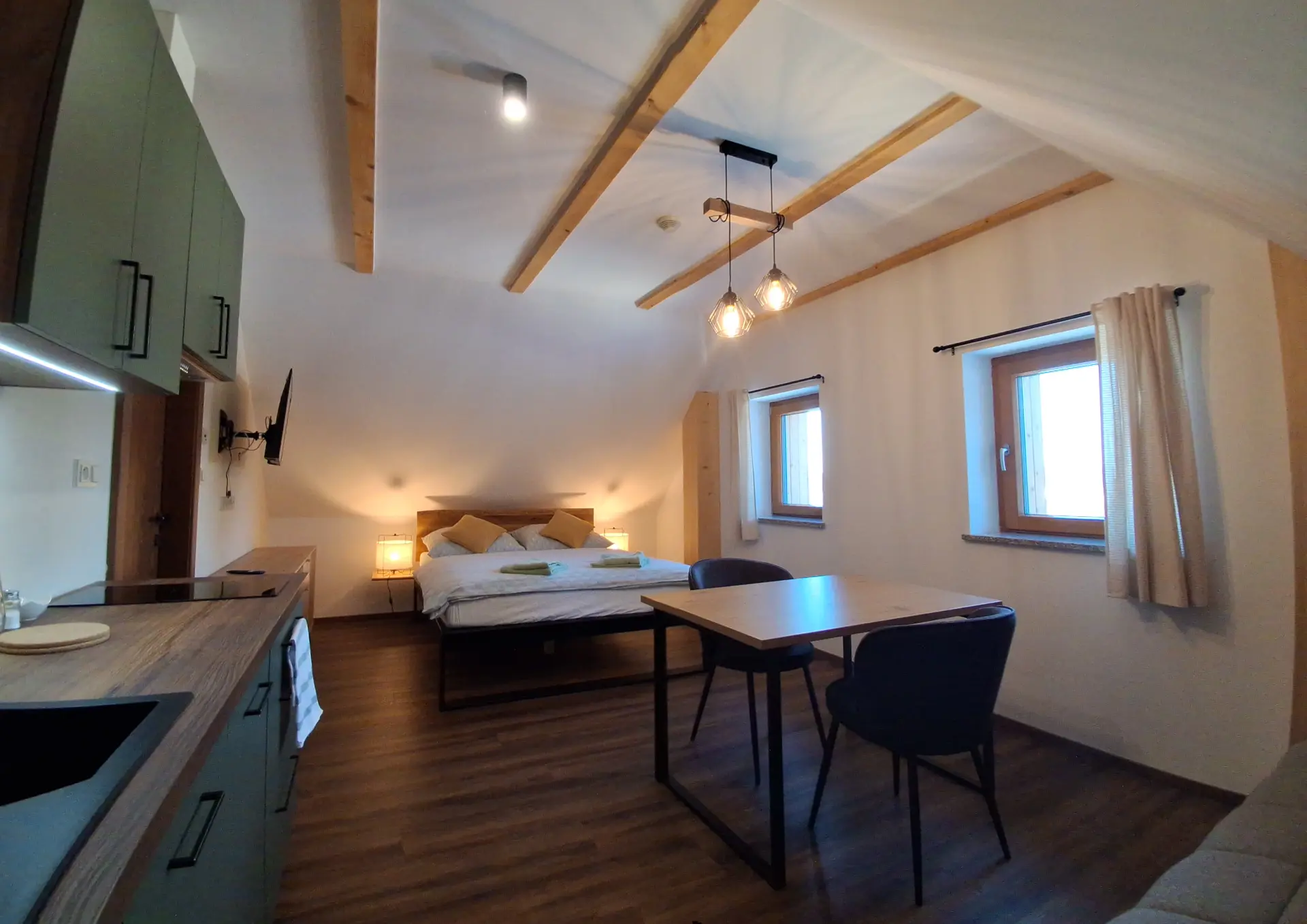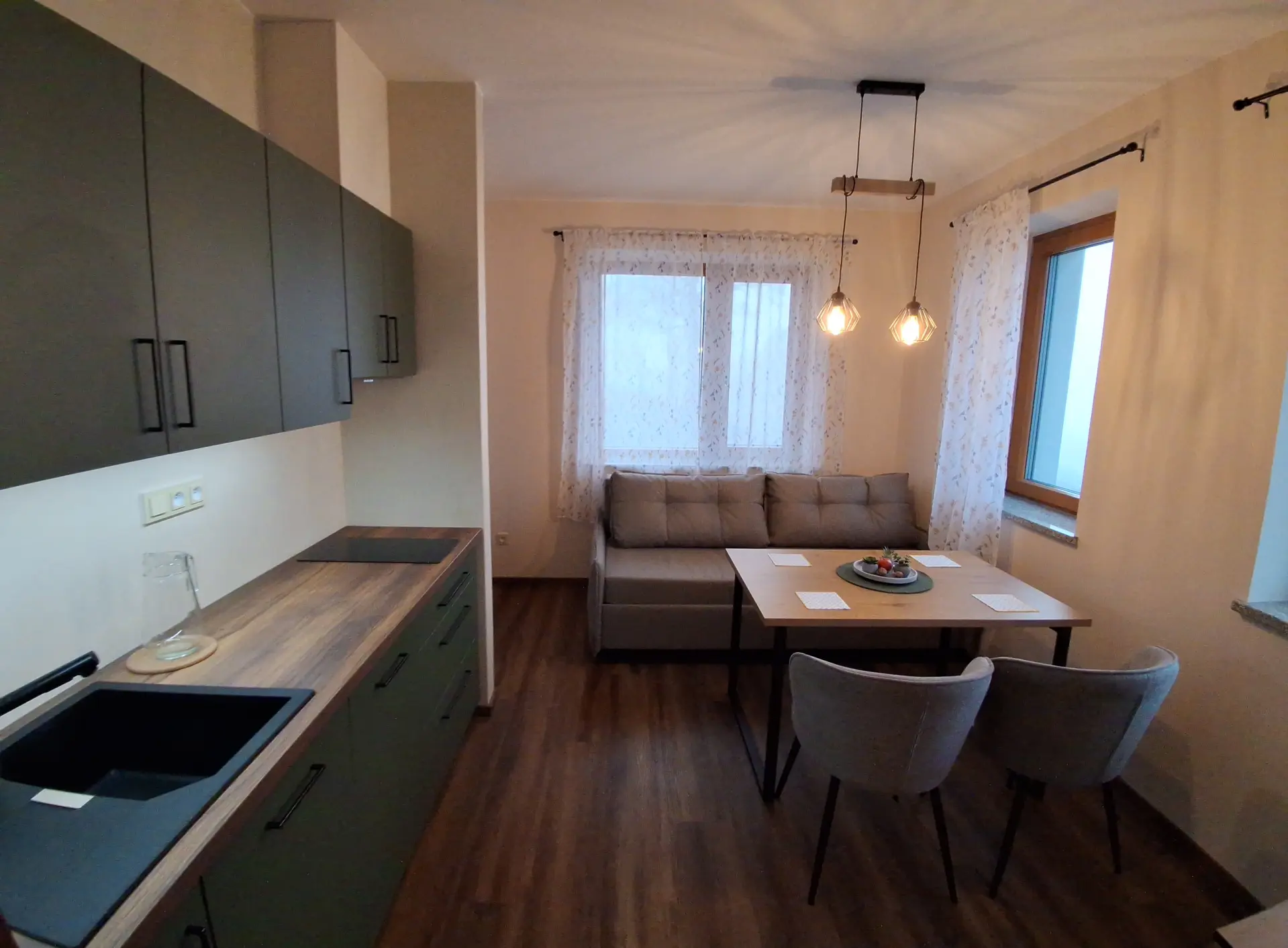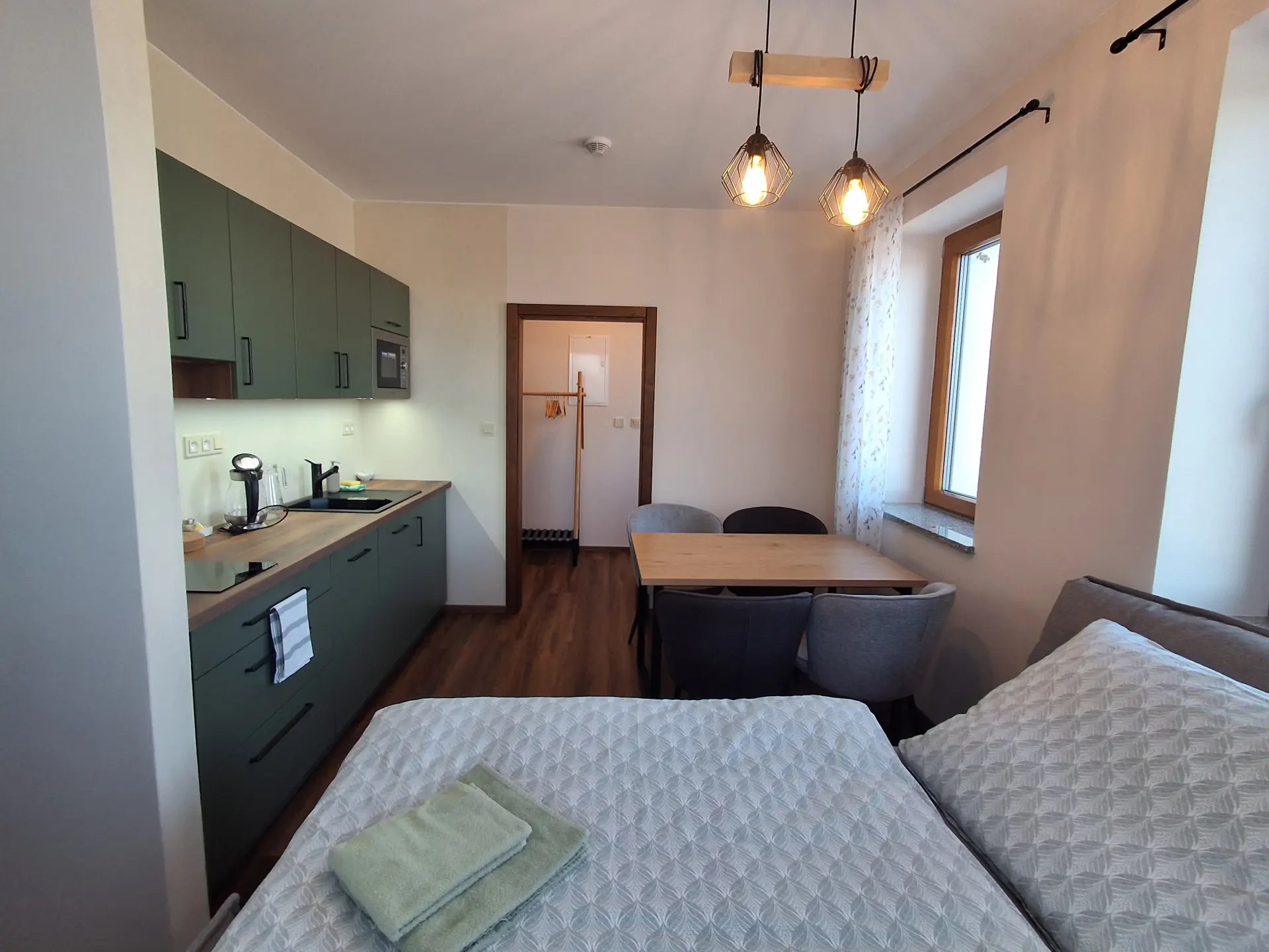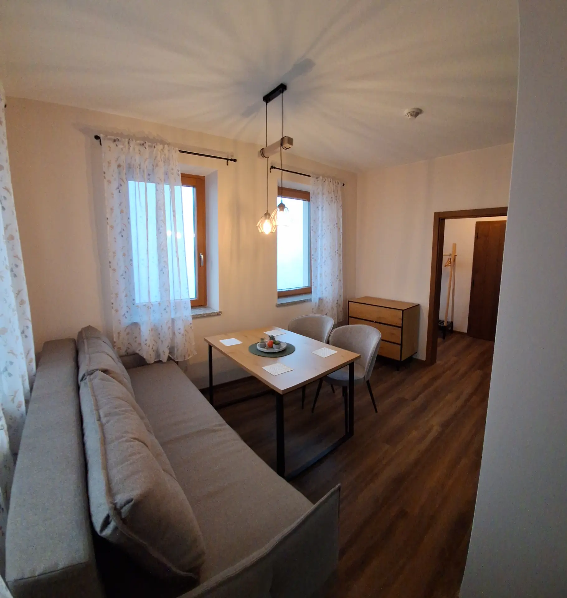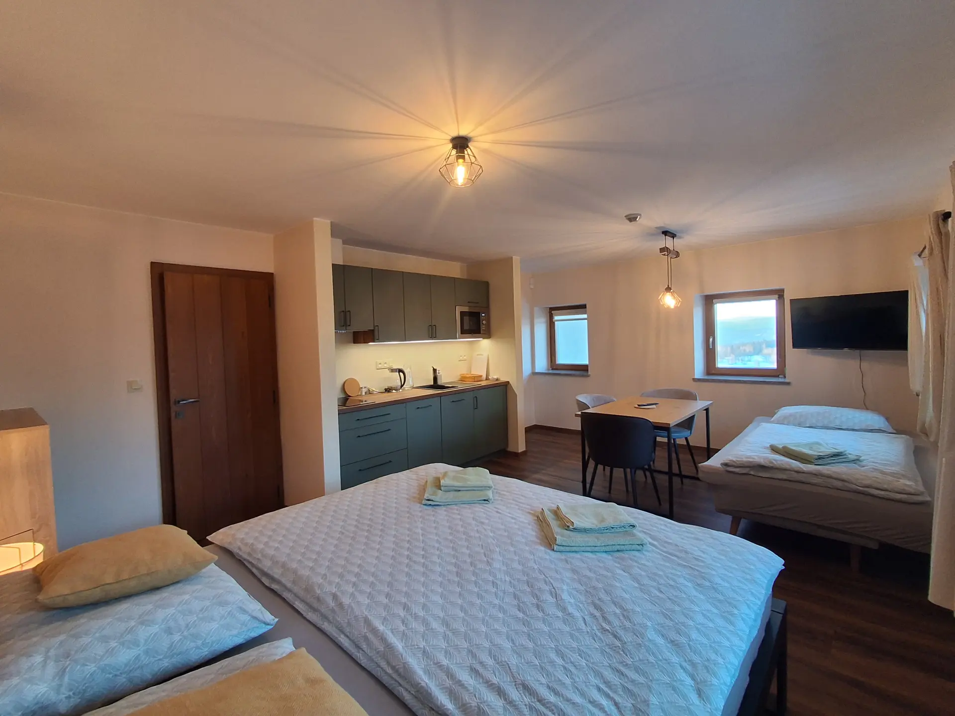 Apartmán v 1. patře počet ubytovaných osob max. 4 - postel 180 x 200cm přistýlka 160 x 200cm. Plně vybavená kuchyň - indukční deska, mikrovlnná trouba, lednice, myčka. Samostatná ložnice, koupelna. Televizor, samostatné připojení k internetu, velikost 34 m2, pěkný výhled na Jizerské hory.
