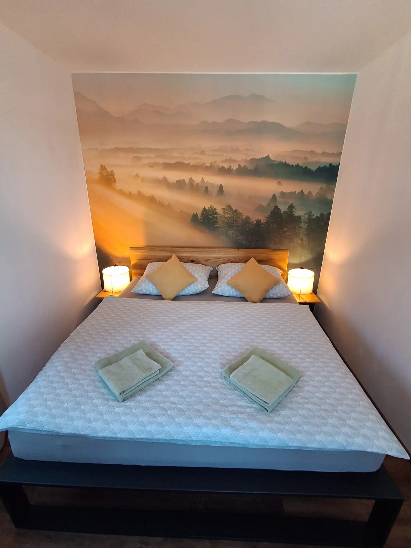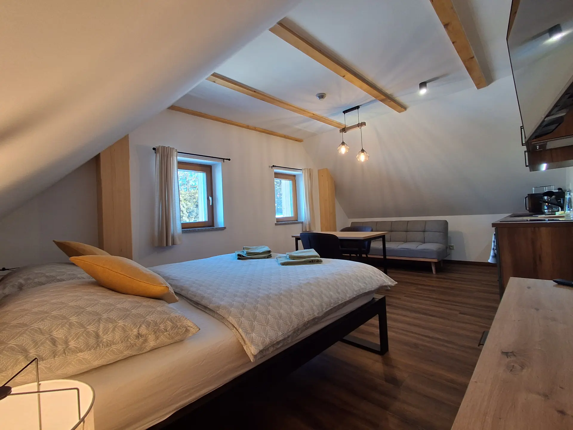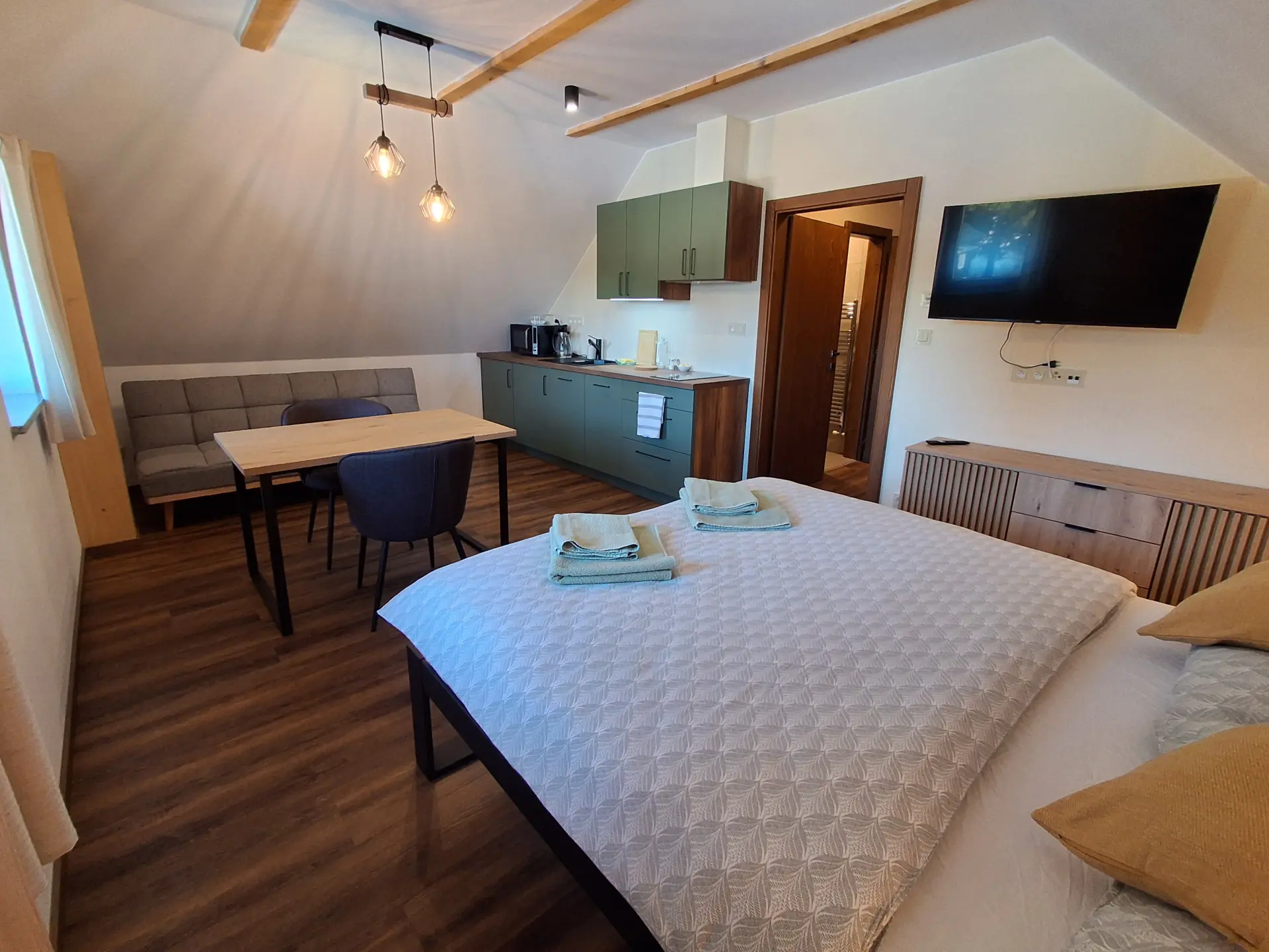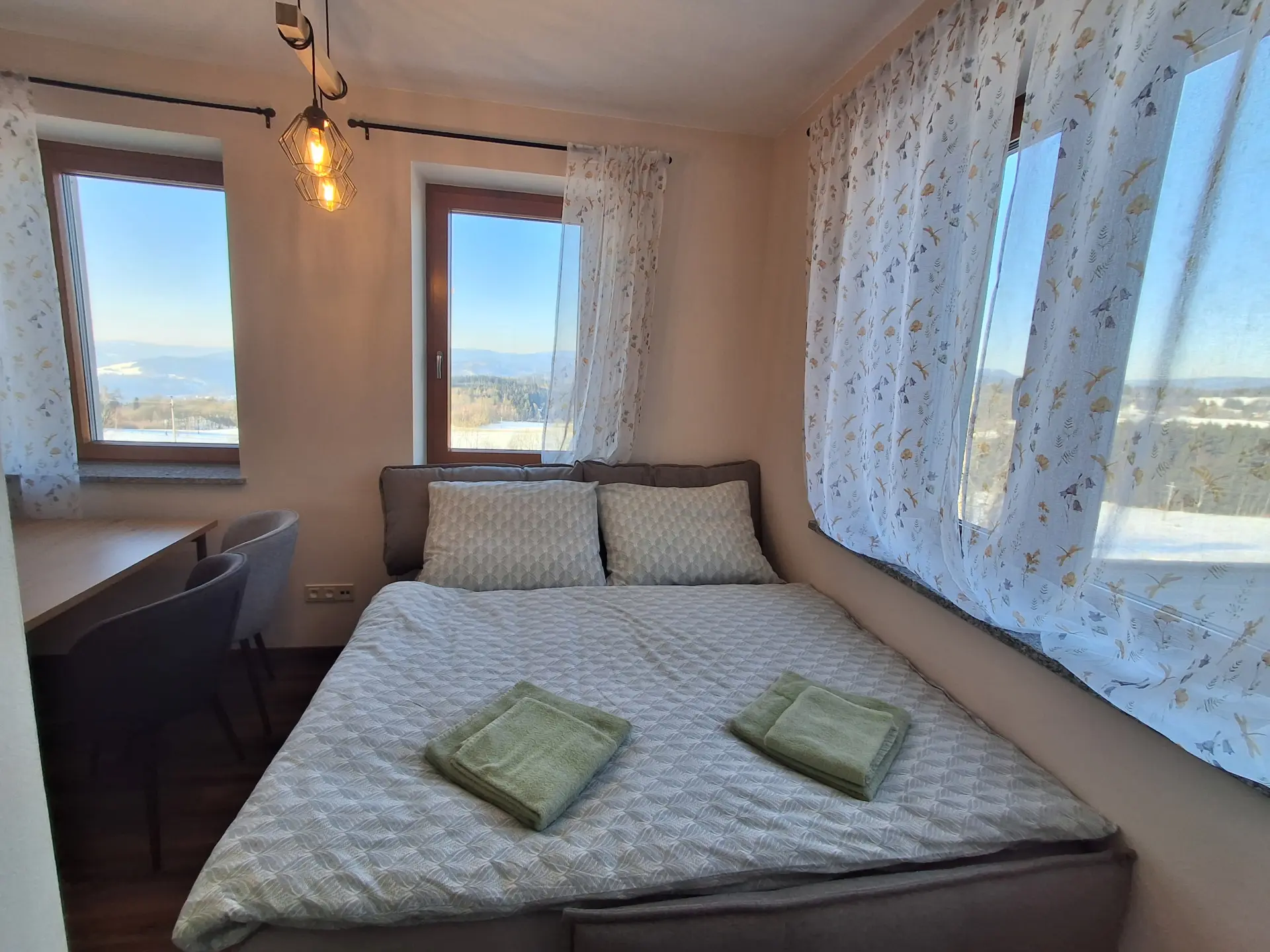 Apartmán v 1. patře počet ubytovaných osob max. 4 - postel 180 x 200cm přistýlka 160 x 200cm. Plně vybavená kuchyň - indukční deska, mikrovlnná trouba, lednice, myčka. Samostatná ložnice, koupelna. Televizor, samostatné připojení k internetu, velikost 34 m2, pěkný výhled na Jizerské hory.